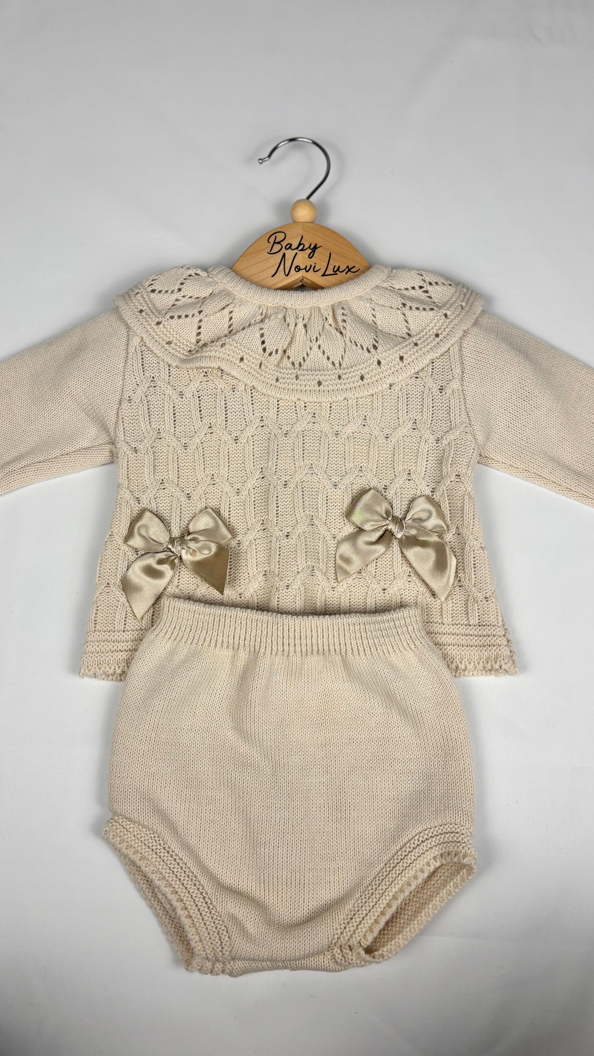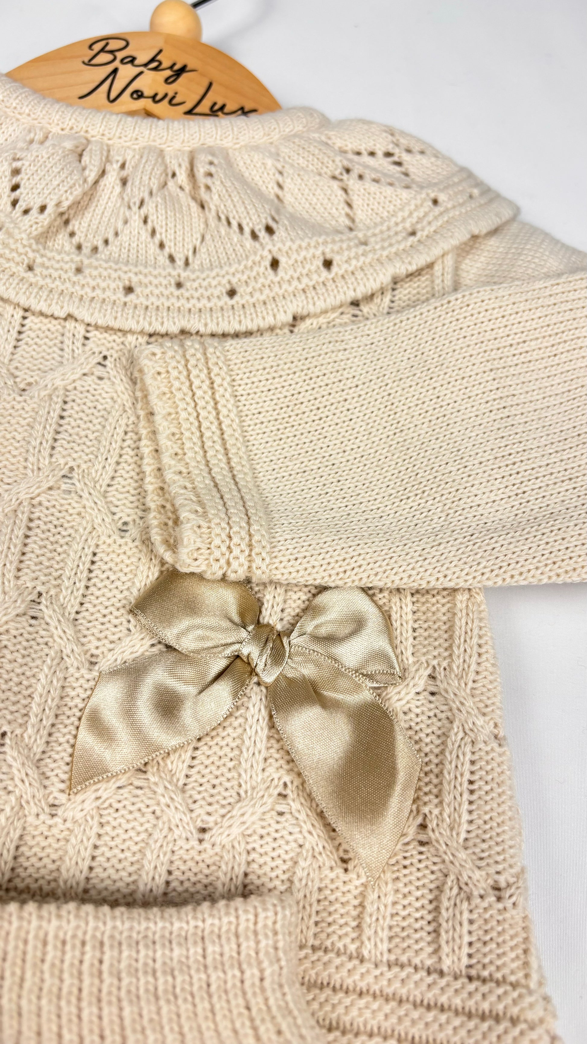 This beige two-piece set features delicate knitted detailing and charming bow accents, offering a sophisticated yet comfortable outfit choice for children. Available in sizes ranging from 3-6 months up to 12-18 months, it ensures a tailored fit for growing little ones. The breathable knit fabric promotes comfort and ease of movement, making it ideal for everyday wear or special occasions. Its neutral tone pairs effortlessly with various accessories, providing versatility in your child's wardrobe.