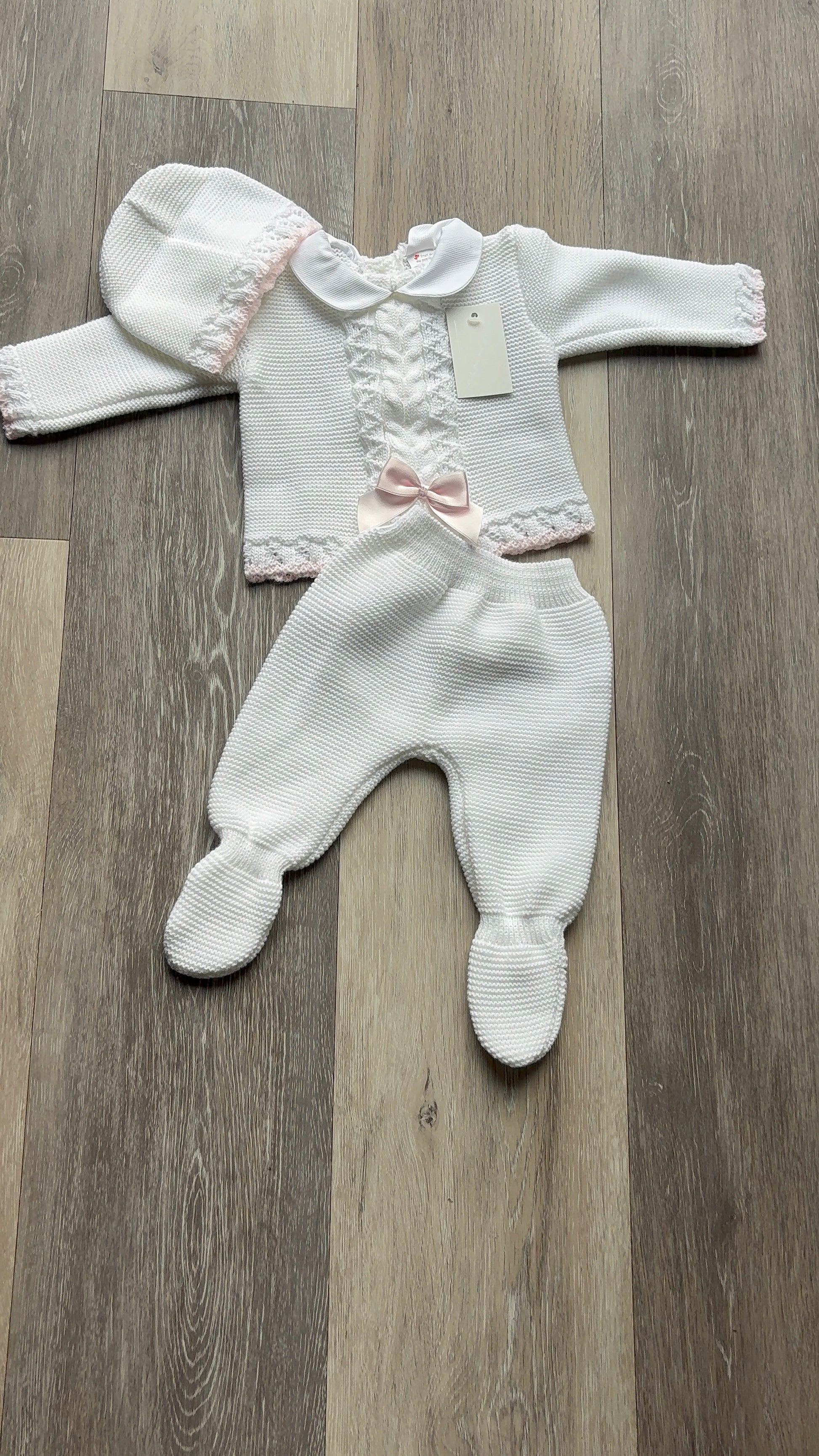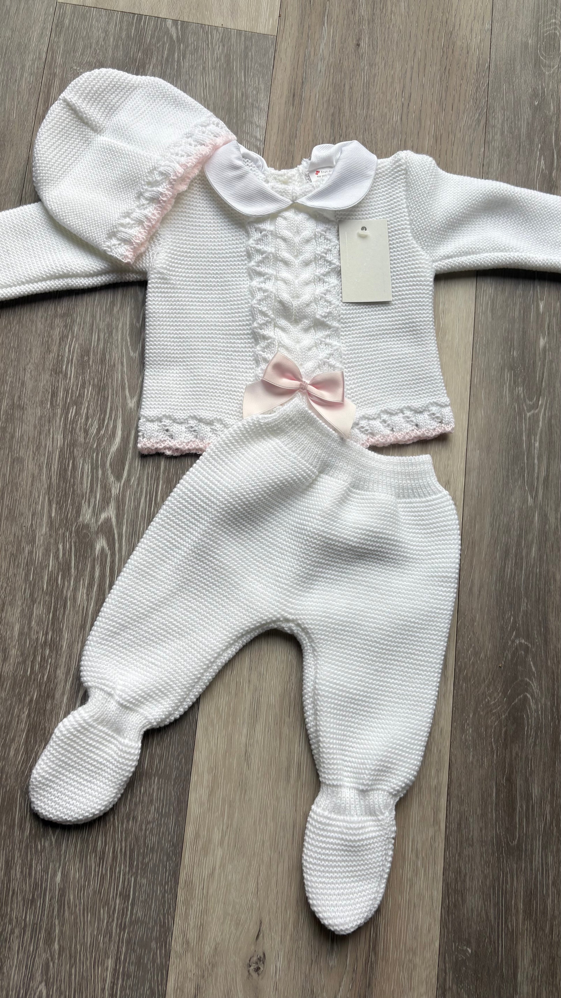 Welcome your newborn in style with this exquisite three-piece cable knit gift set. Designed specifically for delicate skin, each piece features premium cream knitting paired with a charming blush bow detail. This thoughtfully curated collection provides essential layering pieces that grow with your baby while maintaining sophisticated aesthetics. Ideal for new parents seeking quality basics that transition seamlessly from nursery to outings, this set combines comfort, durability, and understated elegance.