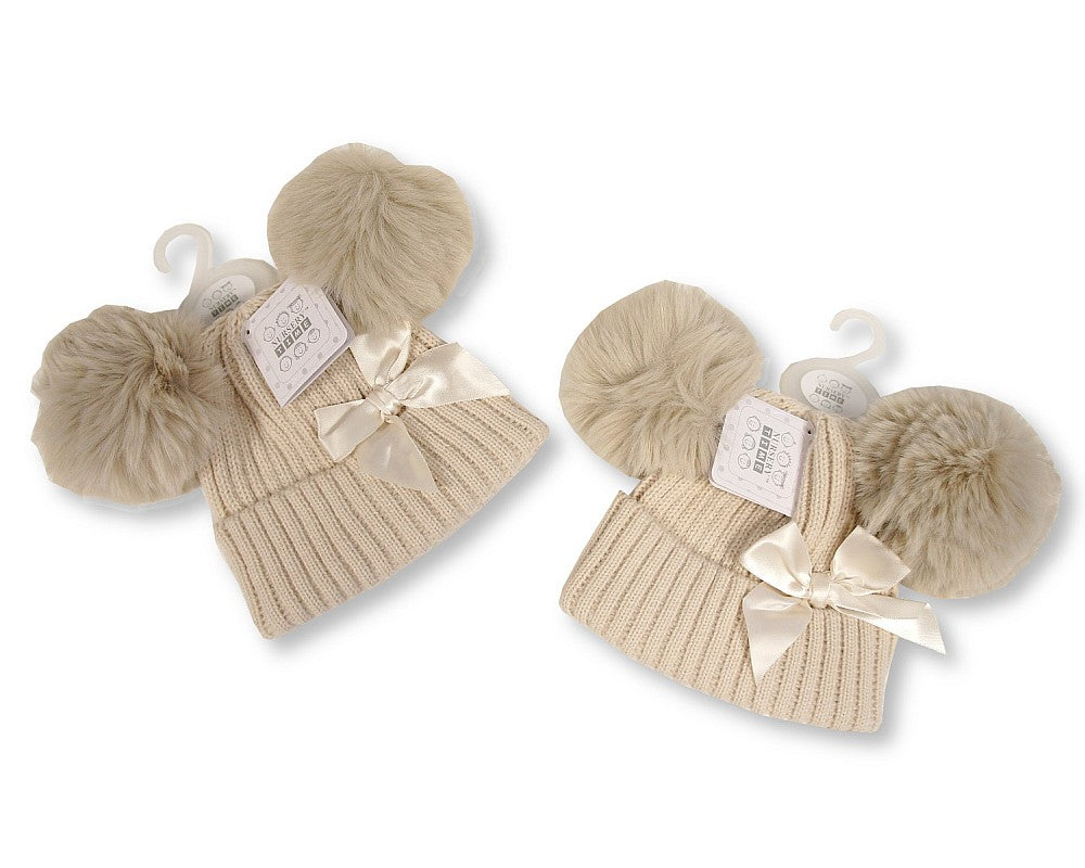 Stay warm and stylish with our Double Pom Pom Hat, complete with a charming bow. This hat is perfect for newborns to 12 months, and is available in one size. Keep your little one cozy and cute all winter long!