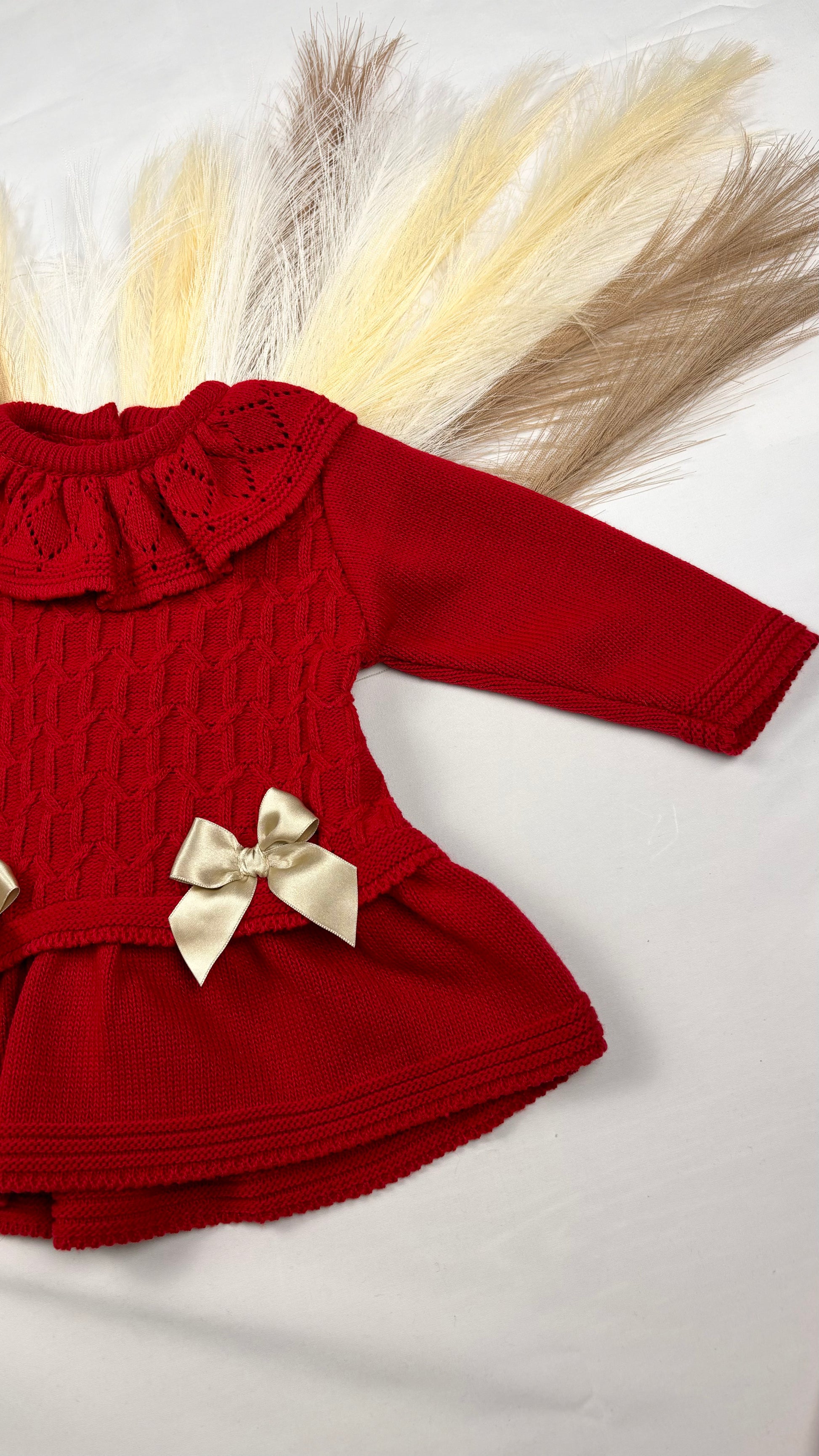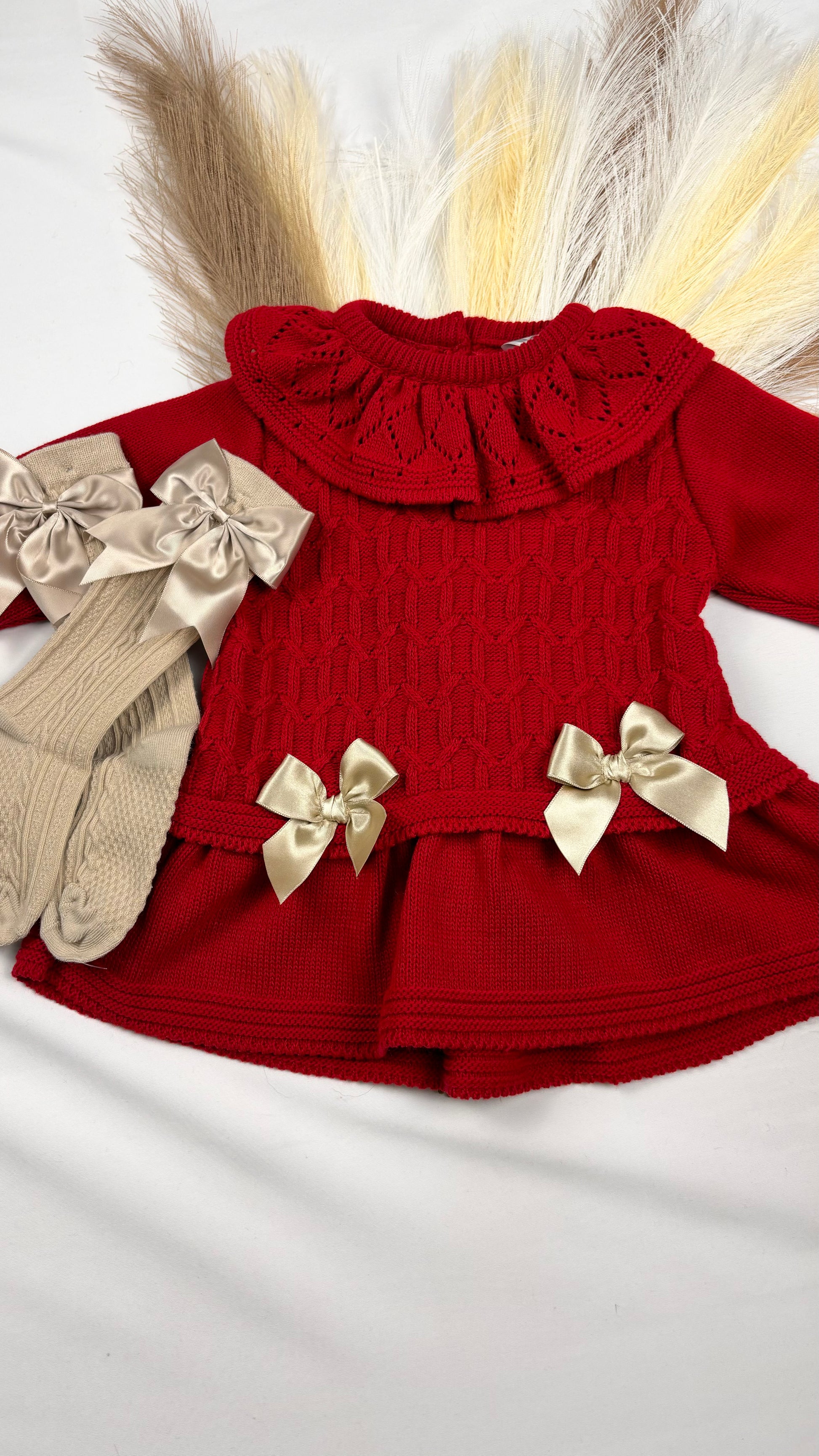 This red Christmas dress, available in sizes 3-6 months up to 12-18 months, features intricate knitted detailing and charming bow accents. Crafted to provide comfort and festive style for little ones, it ensures your child looks both cozy and elegant during holiday celebrations.